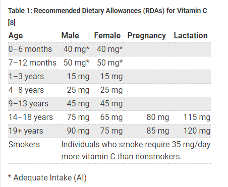 The National Institute of Health recommends the following daily intake of vitamin C:
