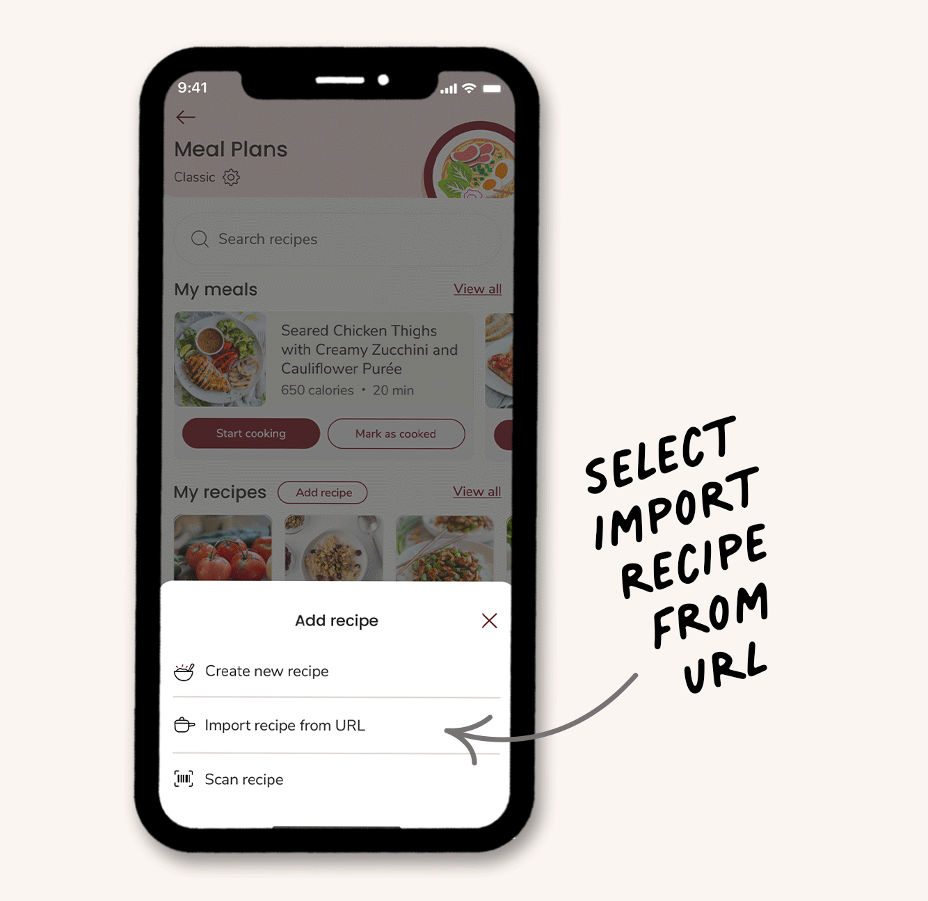 Step 1: Navigate to My Recipes, then select "Add Recipe" and "Import Recipe from the Web."